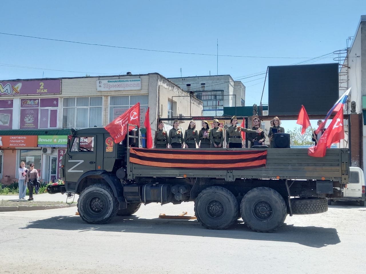 Так же «Фронтовая бригада» отправилась по улицам города с поздравительной программой. Жители города с удовольствием и благодарностью послушали песни военных лет и поздравления С Днем Великой Победы!